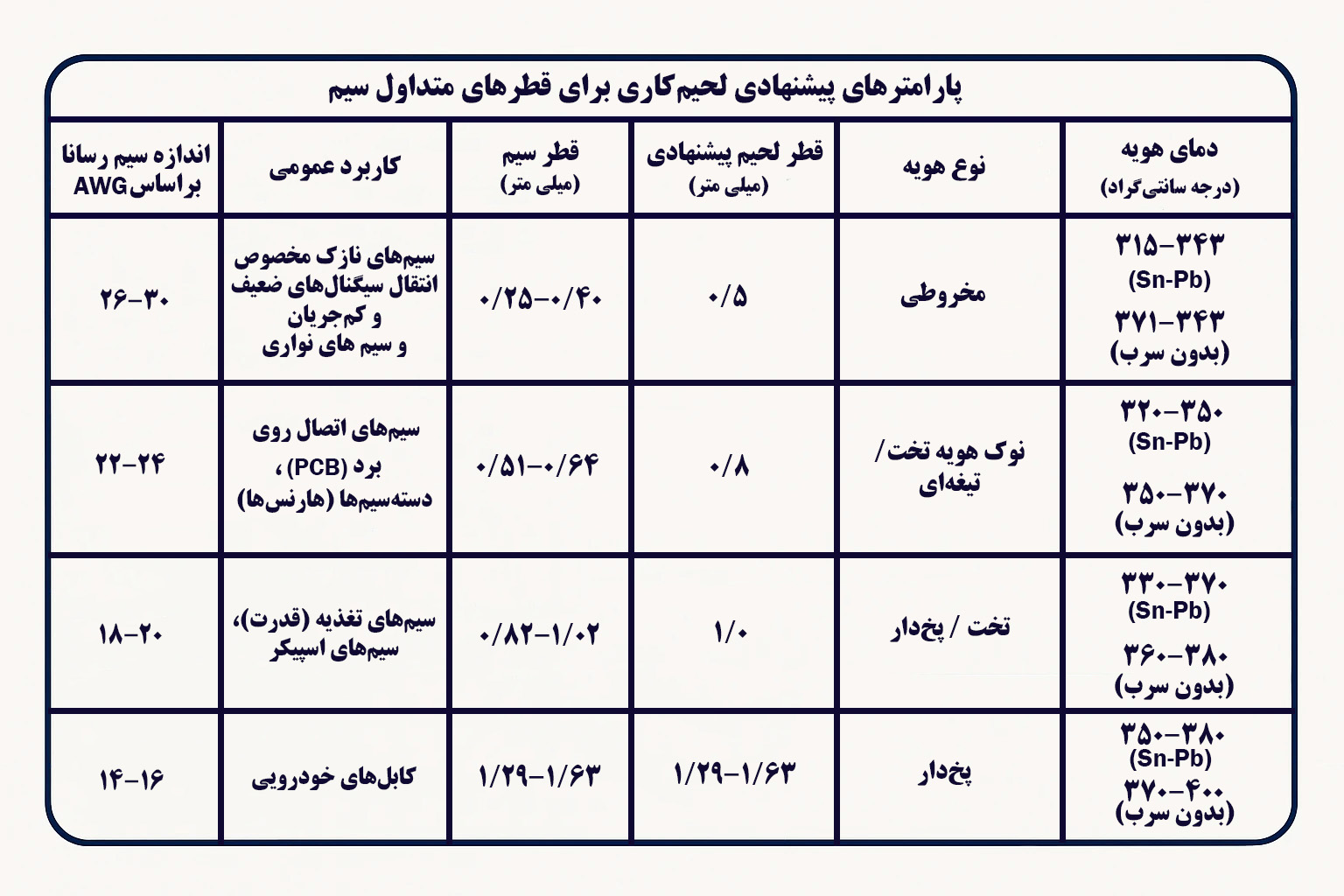 در عمل، انتخاب صحیح قطر سیم لحیم بر اساس اندازه AWG سیم هادی، علاوه بر سهولت فرآیند لحیمکاری، باعث بهبود کیفیت اتصال، کاهش خطاهای اجرایی، جلوگیری از ایجاد اتصالات سرد و افزایش قابلیت اطمینان مدار میشود. این موضوع بهویژه در کاربردهای صنعتی، خودرویی و تجهیزات حساس الکترونیکی که دوام و پایداری اتصال اهمیت بالایی دارد، نقش بسیار مهمی ایفا میکند. بنابراین، در فرآیند لحیمکاری حرفهای، توجه همزمان به سایز سیم هادی، قطر سیم لحیم، نوع آلیاژ لحیم و شرایط حرارتی امری ضروری و اجتنابناپذیر است.