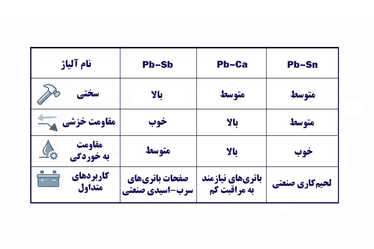 ۲. کدام آلیاژ سربی برای باتریهای سرب–اسیدی مناسبتر است؟