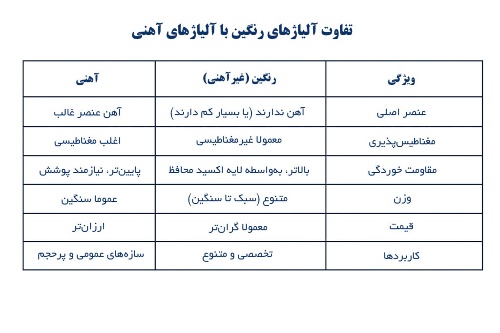 جدول تفاوت آلیاژهای رنگین با آلیاژهای آهنی