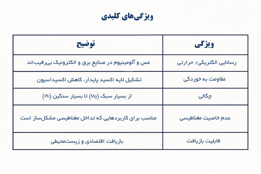 - مس (Cu) و آلیاژهای آن: هدایت الکتریکی و حرارتی عالی بههمراه شکلپذیری بالا