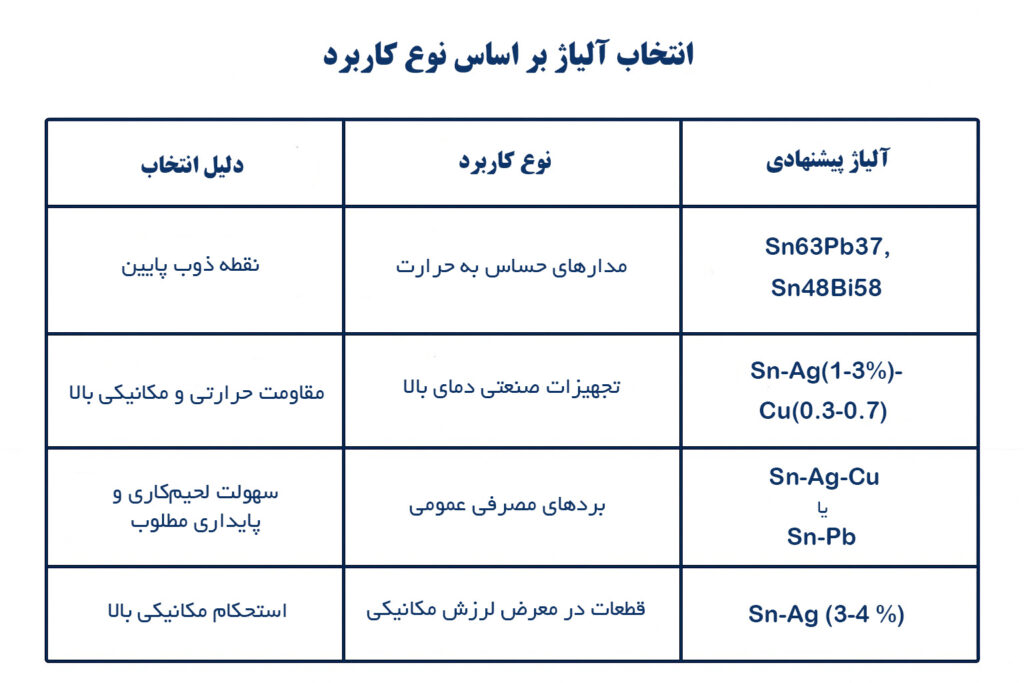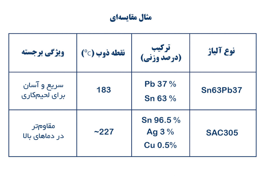 - مونتاژ سریع: آلیاژهایی مثل Sn-Pb با ترشوندگی بالا، فرایند را سریعتر و با نقص کمتر انجام میدهند.