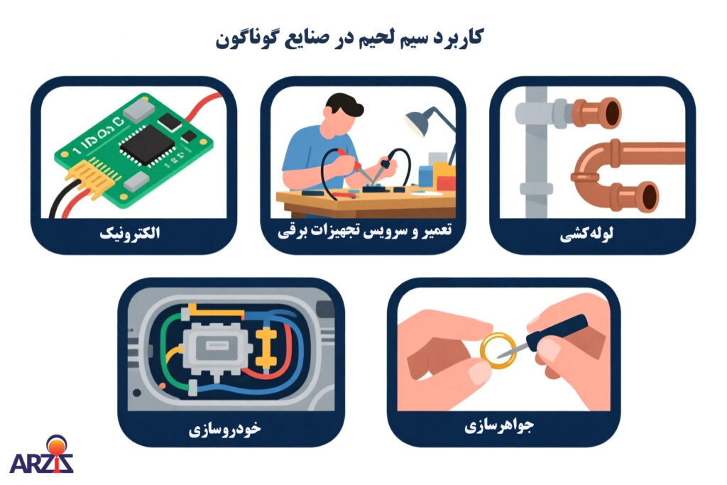 کاربرد سیم لحیم در صنایع گوناگون گسترده است، اما بیشترین مصرف به حوزههای زیر اختصاص دارد: