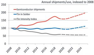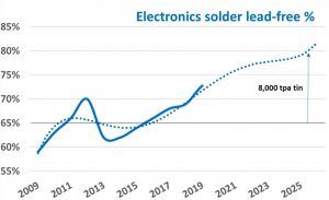 این آمار بهروشنی اهمیت توسعه صنایع الکترونیکی در افزایش مصرف جهانی فلز قلع را نشان میدهد. بنابراین، با توجه به روند رو به رشد فناوریهای مرتبط با صنعت الکترونیک، میتوان پیشبینی کرد که در دهه آینده، نیاز به آلیاژهای لحیم عاری از سرب به طور قابل توجهی افزایش خواهد یافت.