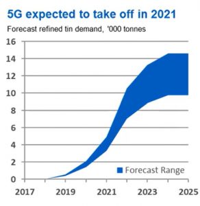 از دیگر تحولات مهم که به افزایش تقاضا برای قلع منجر خواهند شد، میتوان به توسعه فناوری اینترنت نسل پنجم (5G) اشاره کرد. همانطور که در نمودار زیر مشاهده میشود، راهاندازی تجهیزات و گسترش فناوری نسل پنجم اینترنت، نیاز سالانهای معادل حدود ۱۰ هزار تن فلز قلع تا سال ۲۰۲۵ ایجاد خواهد کرد: