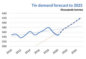 پیشبینی میشود میزان تقاضا برای فلز قلع تا سال 2025 به حدود 420 هزار تن در سال افزایش یابد؛ این مقدار، حدود 40 هزار تن بیشتر از میزان تقاضای فعلی این فلز است.